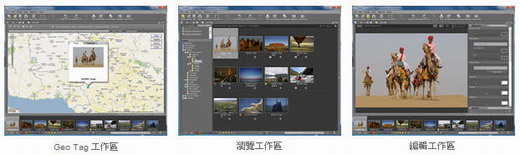 只需簡單的點擊工具欄上的按鈕,便可以能夠容輕易地切換三個工作區 ─ 瀏覽、地理標記、編輯。
