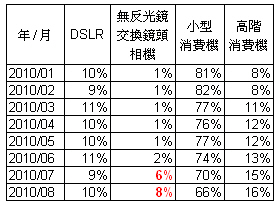 根據上週 Canon 新品發表會所揭露的台灣地區數位相機市場概況資料顯示,今年下半年開始,數位相機市場產生了鉅大的體質變化!原本市佔率都在 1% 左右的無反光鏡交換鏡頭數位相機,突然躍升高達 8% (2010年八月),這當然就是七月份開賣的 Sony 無反光鏡新機: NEX-3/NEX-5 驚人的銷售業績所貢獻,而慘遭突襲的消費機市場,市佔率由原本的 89%左右(含高階消費機)驟降到 82% (2010年八月) 。這樣的變化可說是空前未有的,也讓台灣地區的數位相機市場由原本的 DSLR/消費機/無反光鏡: 10/89/1 的結構,改變為 10/82/8,而這樣的消長可能還會持續進行中!