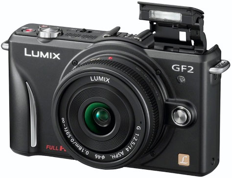 頗受好評的 Panasonic GF1 微型 4/3無反光鏡相機終於有了後繼機種: GF2,外型更加迷你(鋁合金機身小了 19%)、機身也更輕盈(重量減輕 7%)。GF2 與 GF1 雖然同樣使用 12MP Live MOS 感光元件,不過在錄影能力方面則提升到了 1080/30p/60i,並改用了 Venus FHD 影像引擎。但 GF2最大變革則是改用了三吋觸控 46萬畫素螢幕,企圖迎合年輕族群或是女性市場胃口。