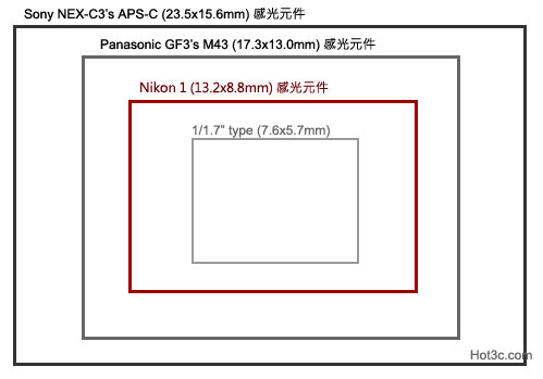 首先令人最意外的是,Nikon 1 系統所採用的 CX 感光元件,尺寸為 13.2x8.8mm,不僅幾乎只有 Sony NEX 的 APS-C 感光元件(23.5x15.6mm)的四分之一,也比微型 4/3系統感光元件 17.3x13.0mm 還小(不過仍比高階消費機採用的 1/1.7" type 感光元件-- 7.6x5.2mm 大了許多)。這樣的抉擇,當然是機身尺寸的考量。Nikon 1 最大的訴求就是小型機身設計(這也是無反光鏡相機最大的賣點!),像是 Nikon 1 J1,機身尺寸只有 106x61x29.8mm,比 Panasonic GF3 的 107.7x67.1x32.5mm 、Sony NEX-C3 110x60x33mm 都還迷你!