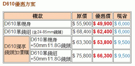 Nikon此波除了大打全幅價格戰之外,還加碼推出D610加1.8大光圈人像鏡超值限量優惠,原價7,400元的50mm f/1.8大光圈鏡頭,只要購買D610就能加價3,900元將鏡頭帶回家,鏡頭等於打了對折,此鏡優惠限量200組,售完為止,推薦近期考慮入手單眼的消費者,現在入手最超值!