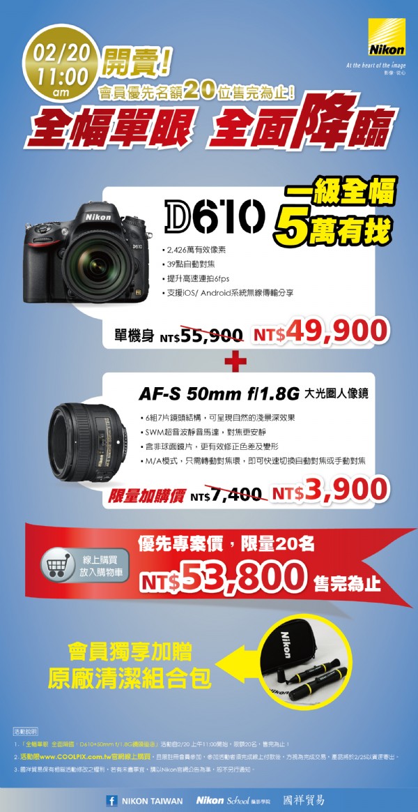 購買 D610 單機身,加購50mm f/1.8G鏡頭,現省 NT:3500 !