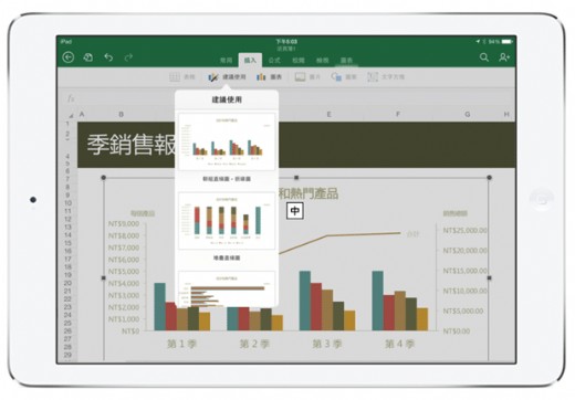 是甚麼讓這些應用程式如此的獨具魅力? 重點在於如何兼顧iPad的使用介面與產品特性,並且不犧牲Office的重要功能中取得完美的平衡。如果您是PC或是Mac Office的使用者,現在這iPad的應用程式能讓您輕易地上手。尤其是Office Ribbon功能表與使用經驗都將會讓您感到非常熟悉,例如Home鍵、插入自動圖表等。