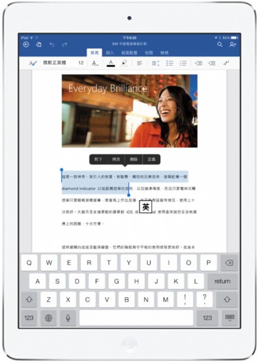 與此同時,這些應用程式可說是專為iPad的使用習慣所量身打造。Office Ribbon功能表中更大的觸控區域,以及疊加選單(overlay menus),讓使用者可以輕鬆地用觸控的方式新增、編輯以及調整格式,以及將圖片等物件調整大小或是旋轉方向,更可以自由地按住並拖曳文字與圖片方塊,不需要再額外透過滑鼠與鍵盤的協助。甚者,您可以善用iPad的特色,例如利用語音聽寫來開始一份全新的Word文件,或是用AirPlayR將簡報檔案無線傳輸至電視螢幕播放,以更酷炫的方式開始您的Office體驗。