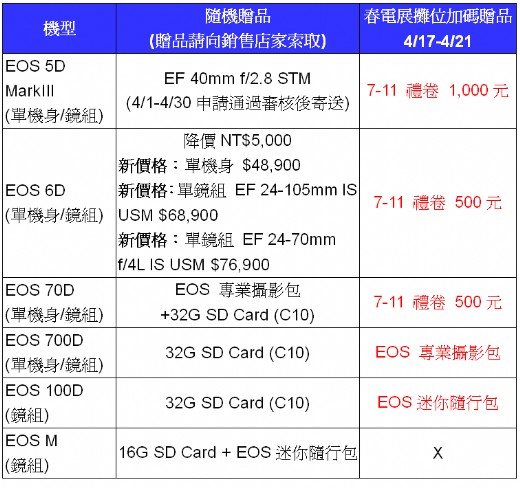 <春電展期間於Canon 攤位購買下列單眼相機,現場憑發票與保卡至服務台即可參與加價購活動>