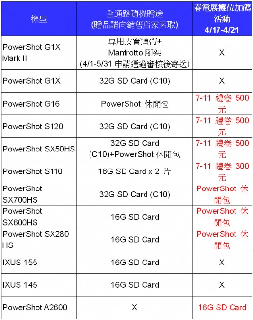 凡於消費者於春電展間期間Canon 攤位購買數位相機/鏡頭/SELPHY印相機/PIXMA印表機/耗材產品(金額超過$1,200),憑當日購買之發票及產品保固卡至服務台即可參加抽獎。