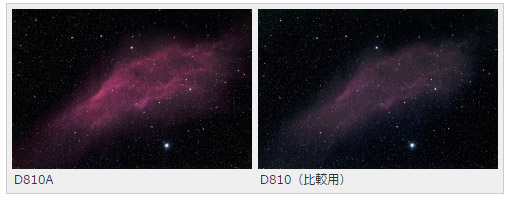 由於通常的數位單眼相機是為人像和風景攝影而設計,為了優化此類場景的色彩還原而抑制了紅色可見光範圍附近的透光率。因此,使用這些相機拍攝來自星雲和星系的帶有H-α射線的影像時,常常照片顏色偏淡。為了解決此問題,D810A在影像感光元件的前方採用了IR-cut光學濾鏡,使H-α射線透光率相對D810同比高約4倍。這樣便能獲得令發射紅光的星雲和星系呈現鮮豔紅色的天文照片。