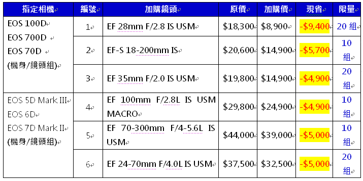4/16-4/20春電展期間,在Canon攤位購買EOS 100D/700D/70D,僅可加購編號1~3之其中一款商品,購買EOS 7D II/6D/5DIII,可加購編號1~6之其中一款商品