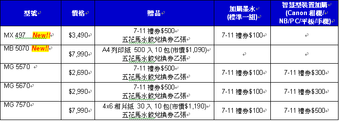 於春電展會場購買任一Canon PIXMA印表機,即加贈五花馬水餃兌換券乙張;現場購買Canon相機,任一廠牌智慧型裝置(手機/平板電腦),憑發票或購買明細,加購PIXMA 指定機種,直接加贈7-11禮券;購買全系列墨水2顆享有85折優惠(以低價者計,不適用墨水組合包)。