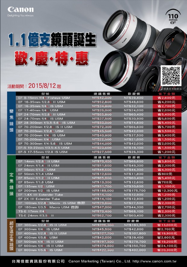 此波降價名單包括多支經典暢銷鏡頭,尤其是攝影愛好者心目中的夢幻逸品「第二代大三元」的經典紅線圈鏡頭:EF 16-35mm f/2.8L II USM 廣角變焦鏡頭、EF 24-70mm f/2.8L II USM 標準變焦鏡頭、及 EF 70-200mm f/2.8L IS II USM 望遠變焦鏡頭,都有 4,000~5,000 元之降幅。而深受人像攝影愛好者所喜愛的兩款f/1.2超大光圈定焦鏡:EF 50mm f/1.2L USM 及 EF 85mm f/1.2L II USM,也降價將近五千元左右。此外,二款百微鏡 EF 100mm f/2.8L Macro IS USM、EF 180mm f/3.5L Macro USM 及變焦魚眼鏡頭 EF 8-15mm f/4L Fisheye USM 也有相當的降幅,對於想要添購鏡頭的消費者來說非常划算。