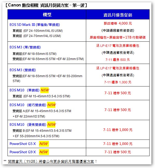 台北資訊月將於11月28日(星期六)盛大展開,Canon推出年終慶促銷活動,現場並有最新上市的三款數位相機登場亮相:主推女性輕巧型迷你單眼 EOS M10、大光圈夜拍高畫質類單眼 PowerShot G5 X及全觸控口袋型類單眼 PowerShot G9X,新品剛上市即可享受優惠好禮,鼓勵搶鮮族立刻享受好康不用等,Canon並同步推出多項年終促銷好禮,豐富的促銷方案讓採購數位相機的民眾年終大省荷包!今年資訊月Canon將在展場大手筆送出香港來回機票,共有五名幸運兒可以享受此幸運大回饋,其他還有人氣自助餐吃到飽餐券、及渡假村泡湯券…等多項幸運禮,讓現場民眾好禮滿懷帶回家!數位相機產品除了以下之優惠方案,Canon 將會於11月28日開展當天再宣布更多驚喜優惠,想要年終採購相機的民眾們務必持續關注相關訊息!