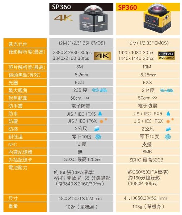 由群光電子代理的 Kodak PIXPRO全景VR攝影機 SP360 4K 正式在台上市。業界首創從處理器到鏡頭全面支援4K影像,打造真4K的視覺體驗,高解析度結合VR虛擬實境應用,享受身歷其境的視覺震撼。小巧正方的外型設計,大幅提升攝影穩定度,創新的半球體鏡頭設計,提供水平360度、垂直235度的拍攝視野,全面顛覆以往的攝影體驗,搭配專屬PIXPRO SP360 4K應用程式,透過Wi-Fi連線智慧型手機即時觀看、分享拍攝效果,更提供11種裁切模式,讓你隨心所欲玩轉Liveview影像。可擴充記憶體與可更換電池設計,珍貴時刻紀錄不間斷,精彩畫面絕不漏拍。此外,針對喜愛戶外極限運動的玩家,防水、防摔、防塵及耐寒特色,提供卓越的攝影體驗。搭配豐富多元的配件,不論上山下海、旅遊探險、日常生活記錄皆可創意取景不設限。Kodak PIXPRO SP360 4K全景VR攝影機即日起正式開賣,建議售價新台幣NT$15,990元。同步推出Kodak PIXPRO SP360 Full HD全景VR攝影機,建議售價也只要新台幣NT$10,990元。