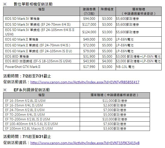配合夏季促銷,凡購買指定型號 EOS數位單眼相機(單機身或鏡組),皆享有超值優惠價格及贈品,包括專業攝影師愛用的專業級單眼EOS 5D Mark IV(單機身或鏡組)降價3,000元且加送5,600元郵政禮券;Youtuber愛用,錄影及拍照功能兼具的APS-C單眼EOS 80D(單機身)降價5,000元且加送LP-E6N原廠電池乙顆及3,000元郵政禮券;適合旅拍的輕巧型全片幅單眼EOS 6D Mark II(單機身或鏡組)降價5,000元且加送LP-E6N原廠電池乙顆;網紅愛用機、C/P值超高的高畫質口袋型類單眼PowerShot G7 X Mark II,降價3,000元加送NB-13L 電池。