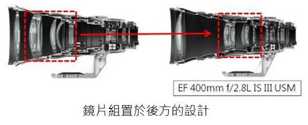 全新EF 400mm f/2.8L IS III USM的光學系統及機械結構均經過重新設計,重量較上一代大幅減輕超過25% (1,010克),成為全球最輕的400mm f/2.8鏡頭[1]。透過仔細審視並重新設計整個光學系統,鏡頭採用2片螢石鏡片及1片Super UD鏡片配合全新玻璃物料,令位於第二鏡片組後的光學系統得以移向更後方的位置,從而實現更輕巧的光學設計。