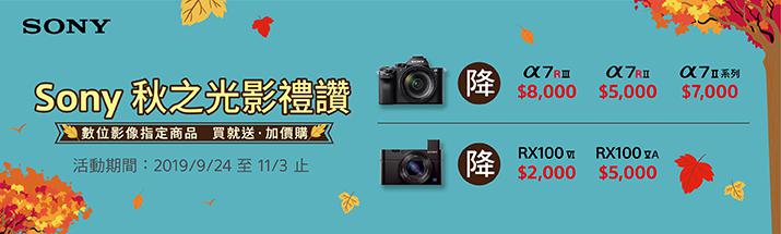 以領先的影像品質以及輕巧機身深獲許多專業攝影師及業餘玩家肯定的Sony α 全系列機種,即日起至2019年11月3日止也推出買就送原廠電池或精美相機包等好禮;購買α6000系列可享3000元限時現金回饋,而a7RIII、α 7RII及α 7II等熱賣機種更分別降價8,000元、5,000元及7,000元,並加碼贈送原廠電池,入手夢幻機種捕捉秋日美好時光正是最佳時機;全片幅及APS-C鏡頭首次推出限時優惠價,活動期間購買指定G Master系列、G系列、卡爾蔡司等鏡頭最多可省7,000元!此外,高居必買清單排行的RX100系列以及更多Cyber-shot數位相機,也大放送推出原廠電池組、相機握把、相機包等贈禮以及限時配件加購價,立即捕捉生動的影音生活!