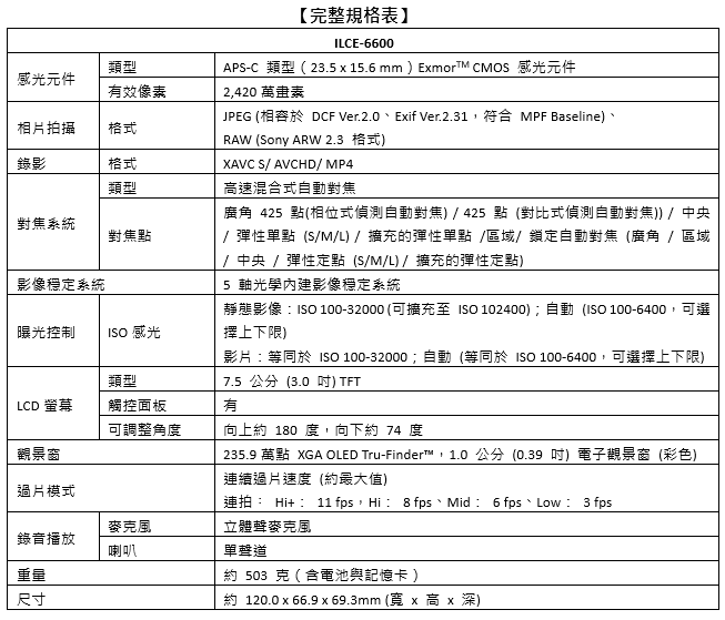 α6600配備 2,420 萬 像素 APS-C 尺寸Exmor CMOS感光元件,結合與全片幅機種同級的進階 BIONZ X 影像處理器及高速前端大型積體電路(LSI),相機性能全面升級。α6600 擁有疾速的0.02 秒 自動對焦(AF)拍攝,而涵蓋率高達 84% 的自動對焦點區域,以及結合最佳相位式和對比式偵測自動對焦技術的高速混合式自動對焦系統,即使在低光源環境下或是拍攝快速移動的主體,仍擁有可靠精準的對焦表現。α6600 亦搭載採用人工智慧(AI)主體辨識技術的卓越「即時眼部偵測自動對焦」功能和「即時追蹤」技術,大幅提升眼部自動對焦的準確性、速度和追蹤能力,確保攝影師能專注於構圖,同時捕捉對焦精準的精采畫面。具備 5 軸影像穩定系統的α6600 讓手持影像創作更有彈性,且支援 4K HDR(HLG) 影片拍攝、麥克風接孔、180 度可翻轉 LCD 觸控螢幕,並首度將續航力更高的 Z 電池運用於 APS-C 片幅相機中,提供專業攝影師最佳操作性能與可靠度,開啟Sony APS-C 片幅相機的全新世代。