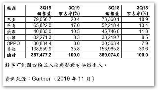 Gartner調查顯示,2019年第三季全球智慧型手機對終端使用者銷售量(下稱智慧型手機銷售量)再度下滑,總計3.87億支,與2018年第三季相比萎縮0.4%。由於消費者越來越在意是否物有所值,導致智慧型手機市場需求持續疲軟。
