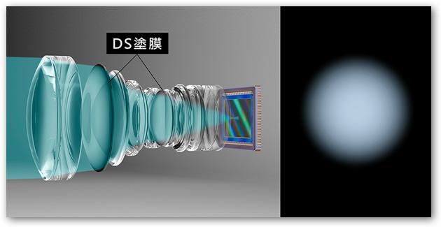 Defocus Smoothing (DS) 鍍膜是 Canon 全新及獨有的氣相沉積 (Vapor-Deposited) 鍍膜技術,可提供柔和而獨特的散景效果,令焦外散景的銳利邊緣變得更平滑柔和。當應用在鏡片表面時,鍍膜結構可逐漸減低鏡片由中央至邊緣的透光率 (Light Transmittance),從而控制鏡頭進光量,藉此讓焦外散景邊緣得以變得更平滑柔和。