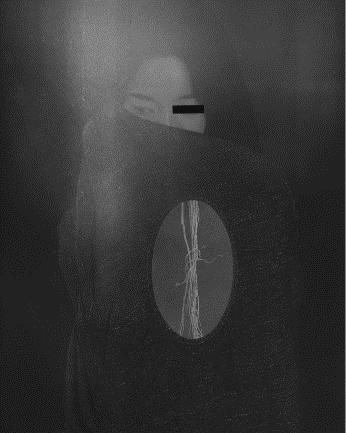 女子肖像中拼貼象徵性元素的黑白影像創作,為作者《花》系列作品之一,其中「花」隱喻著女人味。