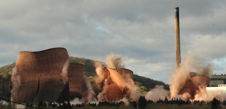 紀錄位於英國施羅普郡鐵橋鎮發電廠的四座冷卻塔在2019年12月被拆毀的瞬間。
