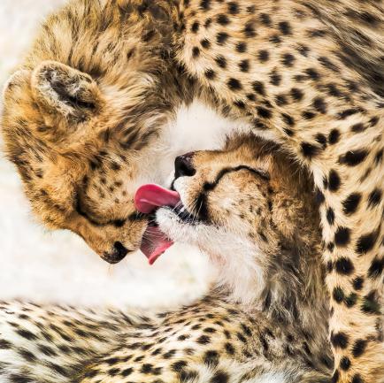 攝於非洲波札那,兩匹獵豹經歷了一場成功的獵食後,正在將彼此舔拭乾淨;在畫面中的姿勢彷彿形成了東方的陰陽太極符號。
