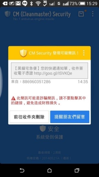 CM Security安全實驗室呼籲用戶盡速下載最新版本CM Security手機防毒App以免遭駭。CM Security安全實驗室已新增用戶回報功能,鼓勵用戶提交可疑訊息以供技術分析,同步更新病毒資料庫,達到最完善的防毒機制,解決全臺約800萬名Android用戶手機安全問題。
