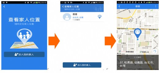 啟用「查看家人位置」功能前,使用者可透過CM Security發送簡訊至對方手機,徵求對方同意之後,即可開始定位其所在位置,系統中同時備有歷史紀錄,雙方都得以藉此了解過去的定位追蹤紀錄。