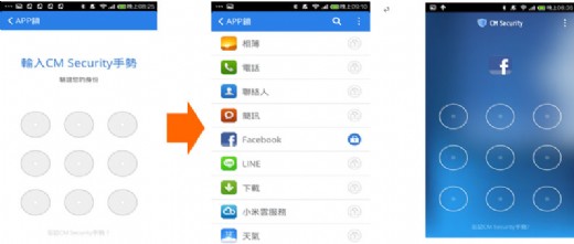 另一方面,為了全方位保護手機資料,CM Security推出全新功能「App鎖」,使用者可自行設定手勢密碼,針對存有個人資料的App上鎖,未來每次開啟上鎖的App時,必須輸入正確密碼方能打開,即使手機借給朋友,也無須擔心個人資料會外洩。