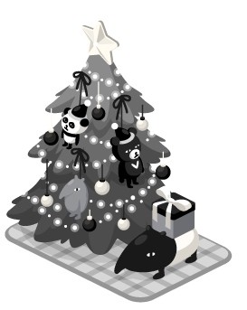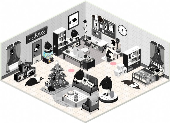 馬來貘的黑白房間內,布置了各種充滿馬來貘插畫的傢俱,例如:馬來貘床單、抱枕、地毯、時鐘等等,還有應景的聖誕樹,以及馬來貘最具代表性的「一事無成」匾額,讓喜愛馬來貘的粉絲與玩家一踏進房間就能感受到黑白插畫的幽默氛圍。