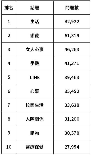 據「LINE Q 十大討論話題」統計發現【詳見圖表二】,Q民們非常重視人際關係的維繫,無論是在生活、戀愛、女人心事、心事或校園生活等熱門話題裡,最常被詢問的問題多是讓人難以啟齒「愛情」問題,包括「女生倒追男生好嗎?」、「如何知道對方有沒有喜歡自己?」、「怎麼與心儀的對象相處和聊天?」可見即使面對感情負面新聞層出不窮,社群世代仍非常嚮往美好的愛情。而「心事」話題的駐站專家貴婦奈奈也特別觀察到:「大部分的發問者是小學生、國中生和高中生。問題多是同儕人際關係、兩性情感、自我認同與自信問題。而且每個問題出現『我也想知道』的人次還不少,可見大家都有類似的困擾卻苦無對象可以暢談、求助。LINE Q 這個平台讓他們能夠匿名發問,讓更多人看見、一起成長。」