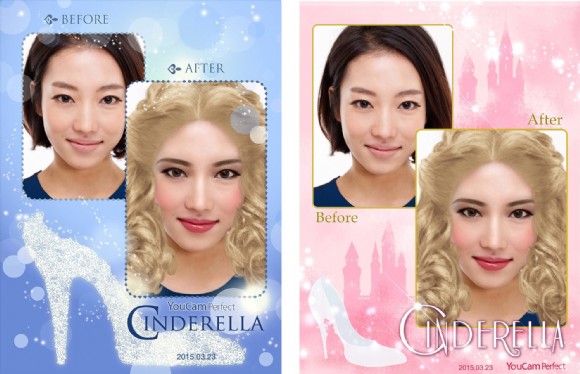 「玩美彩妝」透過免費下載「灰姑娘」及「邪惡繼母」主題妝髮造型,就能讓妳搖身一變成為童話公主!「玩美相機」App也同步推出2款《仙履奇緣》風格相片拼貼,搭配變妝前後相片。