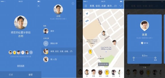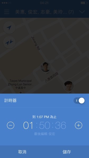 群組創立者可利用「計時器」功能來設定顯示即時定位的時間,時間到群組會自動消失