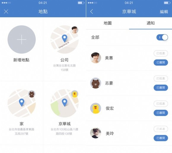 除此之外,LINE HERE也提供用戶設定常用地點,只要開啟App通知,當有群組成員接近或離開這些地點時,手機就會自動跳出通知來告知用戶。例如家長可透過此功能,來即時了解孩子抵達安親班的時間等等。