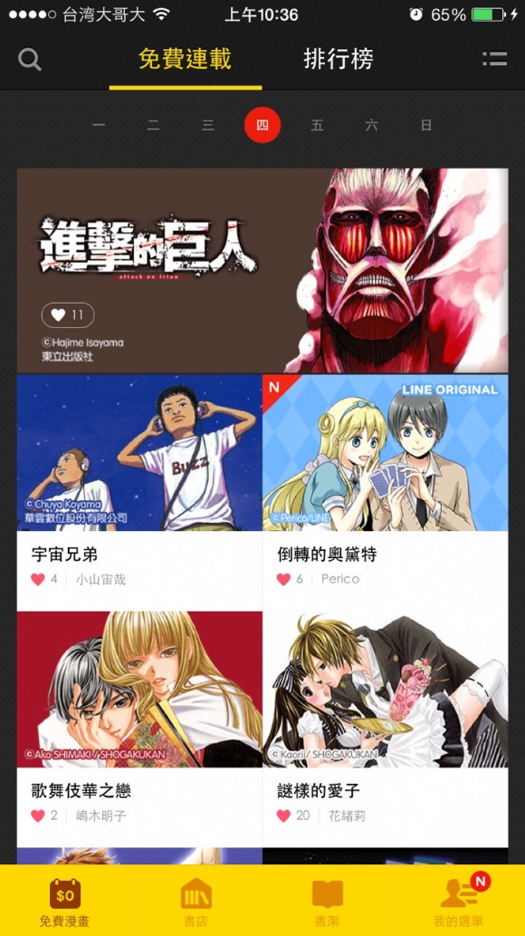 於App中的「書店」區購買《進擊的巨人》、《宇宙兄弟》、《花牌情緣》與《名偵探柯南》等超人氣連載漫畫,購買任一冊就可獲得該作品的繁體中文專屬貼圖。