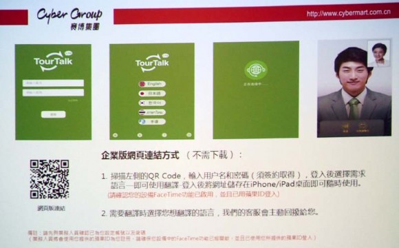 賽博集團於旅展期間首度發表企業版多國語言真人即時旅遊翻譯系統「譯遊Tour Talk」,提供國內商家最簡便的海外旅客在地服務,而民眾版APP將於明年一月推出。而使用的商家只需俱備智慧手機即可使用這項目翻譯系統,「譯遊Tour Talk」早上9點~晚上9點全年無休,商家可透過「譯遊Tour Talk」由真人上線,宛如真人秘書隨身翻譯,與外國旅客的溝通就不用擔心了,而賽博則對使用的商家以”分潤”的概念來收費。
