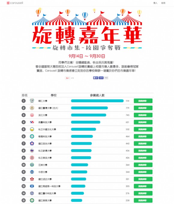 這學期開學季旋轉拍賣為大學生們舉辦了一場前所未見的線上爭奪戰!爭奪戰的冠軍學校出爐!本週末(11/28-29)將在台灣大學鹿鳴廣場盛大舉辦校園市集嘉年華,就是一個以大學生為出發點的瘋狂派對。打破以往對市集的刻板印象,創造出一個融合吃、喝、玩、樂,應有盡有的歡樂氛圍。免費的學生攤位,讓學生出清家中囤積物,順便賺錢錢。
