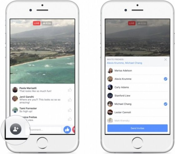 許多使用者喜歡跟朋友一起觀看影片,因此Facebook也增加了在觀看直播時可以寄送觀看直播的邀請給朋友的功能。只要點選「邀請」鍵再選取想邀請的朋友,你的朋友就會透過推送通知收到你的邀請。