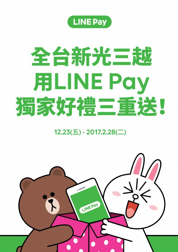 以「智慧入口」為願景的LINE於去年八月發展旗下行動支付服務LINE Pay,持續拓展行動支付情境,與台新銀行合作,於今日宣佈將於12/23起,LINE Pay將串聯新光三越全台16家百貨,並將同步推出LINE FRIENDS品項抽獎、與新光三越限定專屬貼圖等多重優惠。