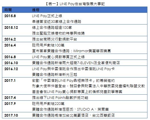 LINE Pay不僅持續拓展線上與線下的支付場景,還參與社會貢獻,2016年初提供台南賑災行動捐款平台,註冊用戶數一舉突破百萬大關,隨後發展LINE Pay愛心捐款專頁,並於2016年底與中國信託銀行聯手推出中國信託LINE Pay卡,更參與拓展LINE Points點數的使用通路。