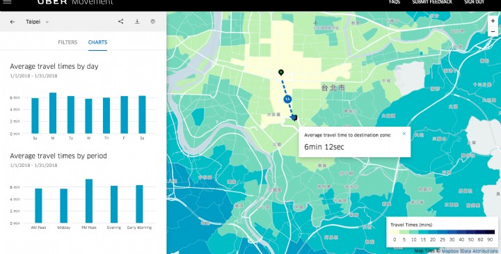 今天我很高興地宣佈台北加入目前涵蓋全球 5 大洲, 20 個城市的 Uber Movement 行列。 Uber Movement 是提供平台行程去識別化的交通資訊,整合於公開網站,能以視覺化方式顯示不同時間、日期、月份的交通情況,或甚至是城市大型活動與道路封閉對交通的影響。