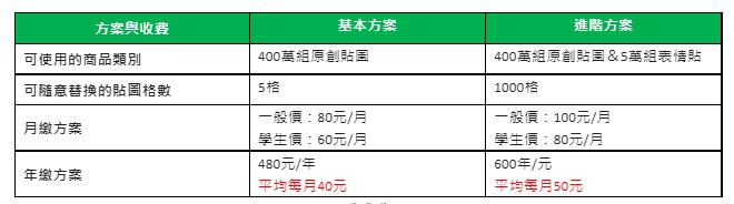 「LINE貼圖超值方案」有「基本型」與「進階型」兩大類,各分月繳、年繳及學生共六種方案。「基本型」平均每月最低40元起,即可享受超過400萬組原創貼圖的任選即用;「進階型」方案更加碼超過5萬組表情貼,讓同時喜愛貼圖與表情貼的用戶,恣意享有豐富的溝通樂趣。所有方案皆特別提供首月免費試用,學生族群另有特別的優惠方案可供選擇!
