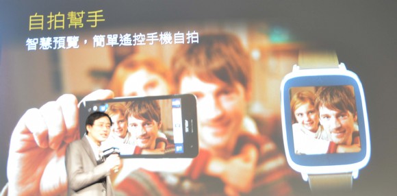 ZenWatch,搭載Android Wear作業系統,可與ZenFone及其他搭載Android 4.3作業系統以上的智慧手機進行配對,不必拿出手機,也能即時接收社群、Email、天氣提醒等生活相關資訊 , 透過Remote Camera功能不僅能在ZenWatch錶面同步顯示手機鏡頭畫面,還能透過轉動手腕或觸碰錶面進行遠端遙控,毋須自拍神器也能人人皆入鏡。
