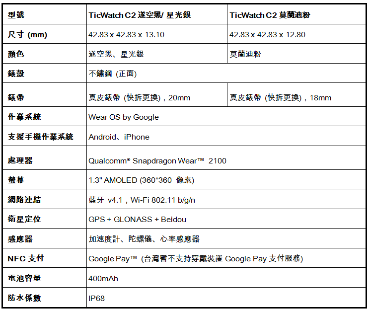 TicWatch C2的C代表Classic經典設計之意,以純圓造型簡約外觀,佐以316L不鏽鋼材質錶盤及真皮錶帶,加上精心製作的內建風格數位錶盤,並搭載最新版Wear OS by Google作業系統。