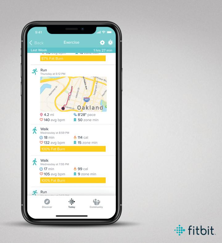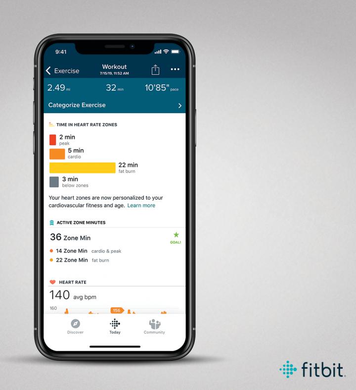 用戶每在燃脂區間做一分鐘的中等強度活動,就能獲得點數;在心肺和高峰區間進行高強度活動則可獲得雙倍點數。活動區間分鐘數會自動計算,以便用戶迅速瞭解運動狀況,與每日、每週的目標差距。每次變更區間時,手環會即時發出提示,以便評估需增加或降低強度,讓鍛鍊更有效率。此外,用戶亦可在Fitbit App查看詳細的個人心率區間摘要,促使用戶更了解個人身體狀況,同時也能不斷挑戰自我,將鍛鍊的每一分鐘發揮最大成效。