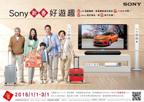 現在購買Sony BRAVIA 4K液晶電視、BRAVIA Theatre家庭劇院指定商品,並於Sony官網(http://tw.sony-asia.com/microsite/support/registration.html )加入會員並完成線上註冊,即可參加「TOYOTA YARIS汽車乙台」抽獎活動!
