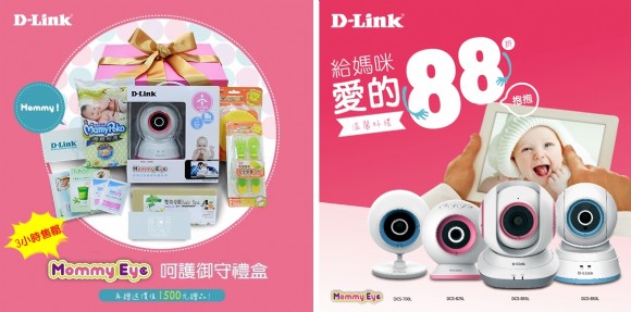 D-Link友訊科技特別在婦幼節前夕,針對旗下產品寶寶無線網路攝影機,以芬蘭媽媽寶盒為設計概念,限量推出十組「媽咪愛御守禮盒組」。消費者除了購得旋轉式寶寶攝影機DCS-850L,更可獲得禮盒中搭贈之多款媽媽寶寶必需品,如Hair Spa體驗折價券、嬰兒餐具/尿布/紙巾用品、親子攝影折價券等總市值約1,500元的婦幼夯品/折扣。D-Link於母親節前加碼推出「給媽咪愛的88(抱抱)」活動,即日起至4月底止,凡於各大經銷門市或線上平台皆可享有MommyEye系列攝影機最低88折之優惠。