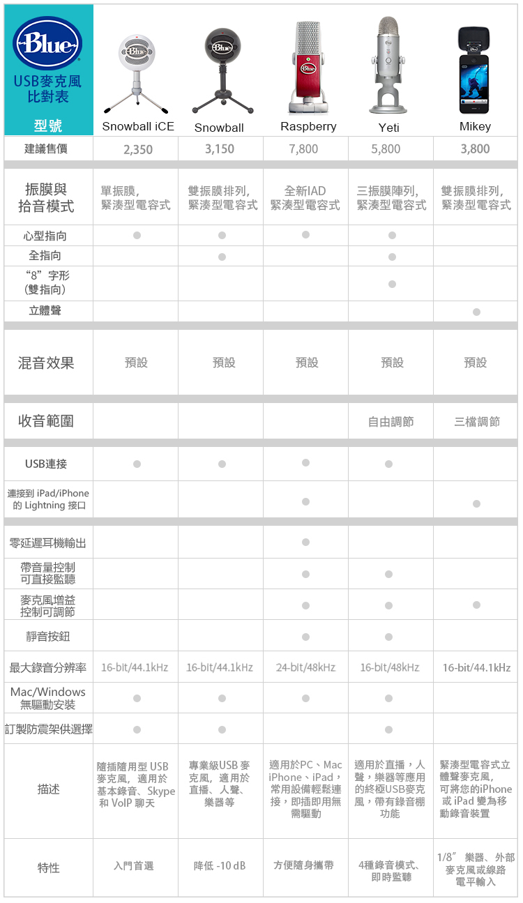 人人都是主播,全民直播時代來臨,Blue Microphone台灣再推USB麥克風生力軍,市場唯一具備攜帶性的電容式麥克風—Raspberry全裝置USB麥克風,iPhone大小的輕巧外型,方便用戶隨時隨地都能隨意選用手機或電腦進行錄音室等級的收音;而全新入門款—Snowball iCE 小雪球USB麥克風,則以精緻弧形的復古圓球造型讓用戶突顯個性,加上價格親民亦可輕鬆入手,CP值破表。Blue麥克風完整產品線因應不同使用者的需求,無論是進行實況/直播、聲樂/樂器收音、語音聊天或視訊對話,就是要讓你的心血得以絕佳收音品質記錄與傳遞,擺脫天籟之聲被扭曲為地獄之音的夢靨,為你的創作神助攻。