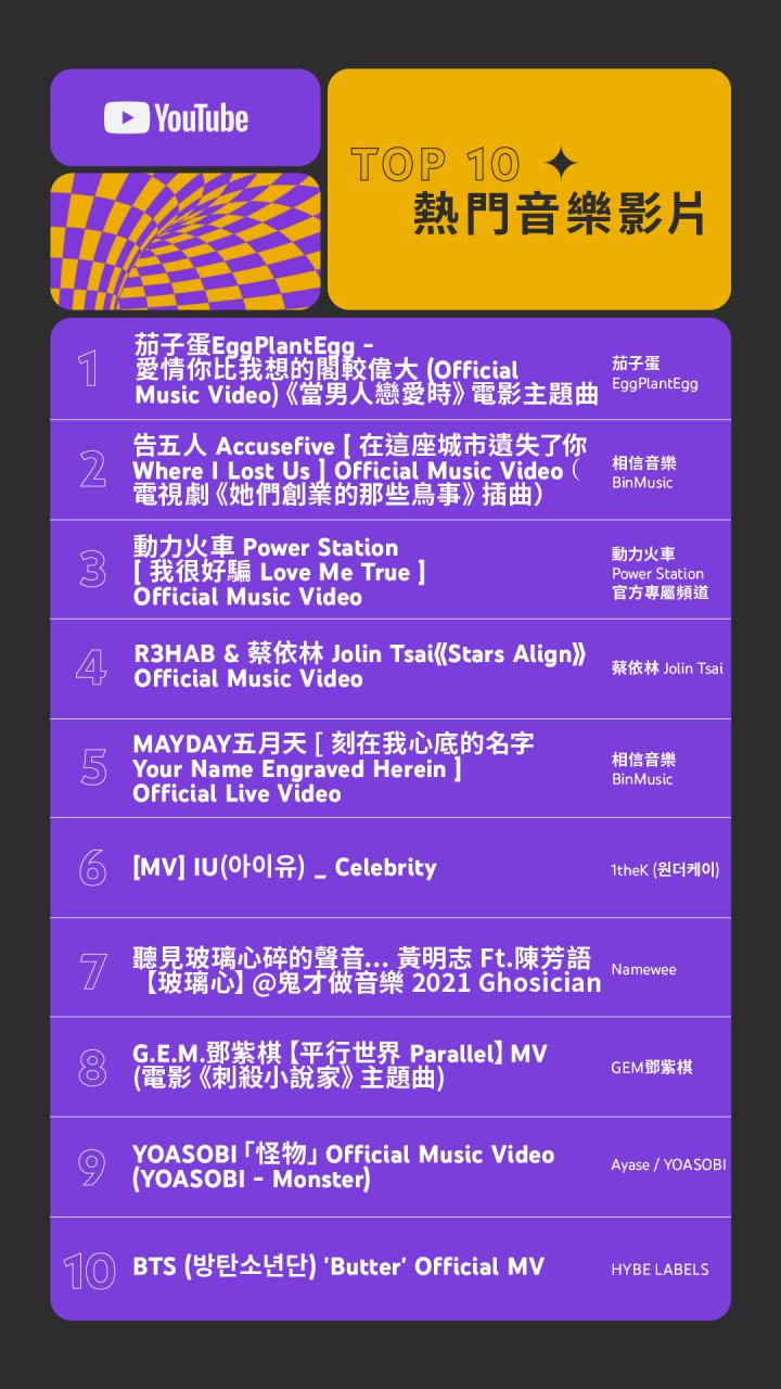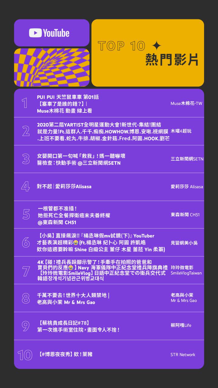 今年「熱門影片」排行榜反映出人們在疫情期間對療癒舒壓、啟發人心、時事議題類型的影片感興趣,像是《天竺鼠車車》、《一根管都不准插!她拒絕死亡全餐捍衛癌末夫善終權》以及《對不起》和《欸!萊豬》;創作者「玲玲微電影」以多語言標題記錄中正紀念堂禮兵陣仗,成功接觸到更廣泛的使用者關注。此外,集結藝人和多位平台創作者的影片,不論是網路綜藝節目木曜4超玩傾心製作的 YARTIST 全明星運動大會,以及「見習網美小吳」與知名歌手楊丞琳合作拍攝的假試鏡整人企劃,都創造極大的社群討論熱度。