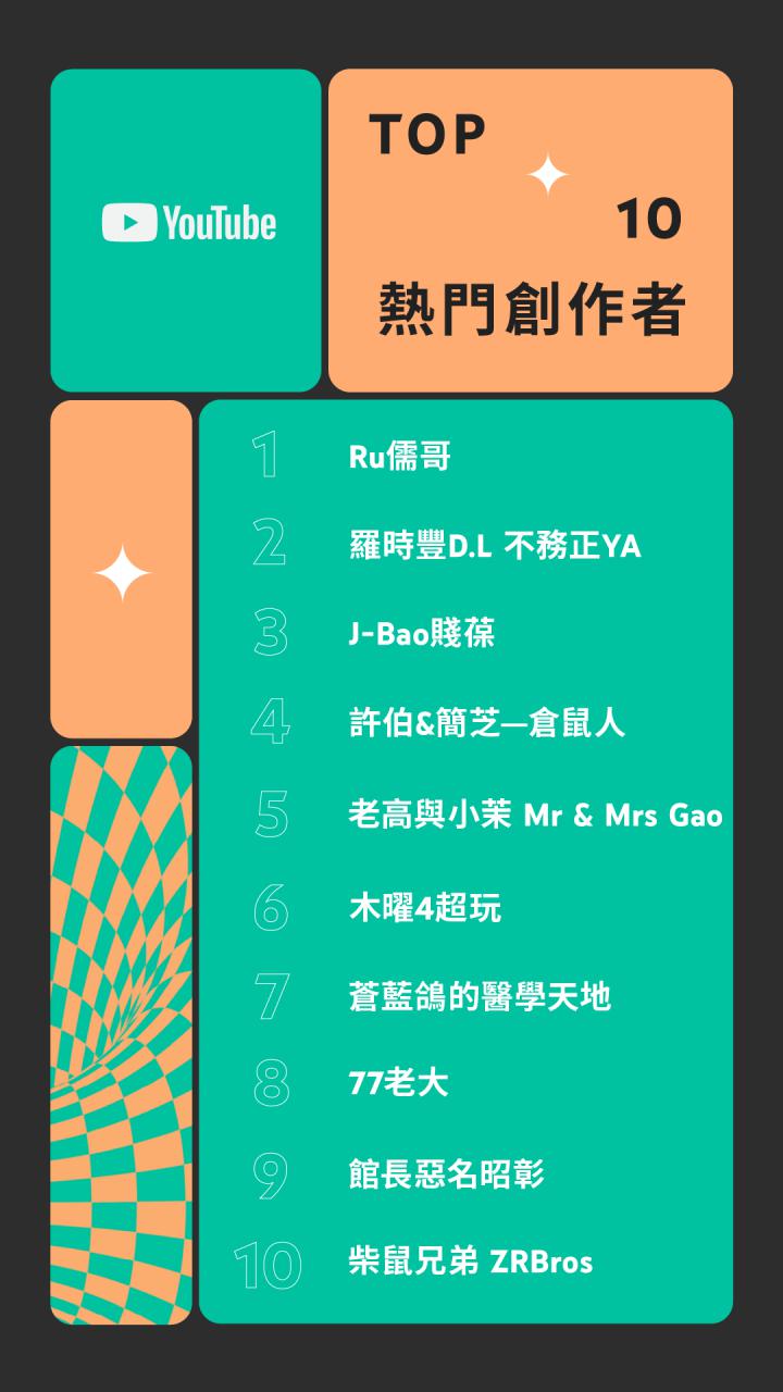 疫情下有更多觀眾在 YouTube 利用影片自我充實,「許伯&簡芝—倉鼠人」、「老高與小茉 Mr & Mrs Gao」、「蒼藍鴿的醫學天地」和「柴鼠兄弟 ZRBros」知識型內容在「熱門創作者榜單」分別獲得第四、五、七和第十名,顯示許多觀眾對於動物知識、科普時事、醫療健康與投資理財方面資訊和概念的學習需求。國民姑丈羅時豐的「羅時豐D.L 不務正YA」和資深藝人邰智源主持的網路綜藝節目「木曜4超玩」持續透過 YouTube 揮灑創意為觀眾帶來歡笑,這也顯示傳統藝人與綜藝節目紛紛從電視朝向網路發展與轉型。個人特色鮮明的創作者也發展出更加分眾化的內容主題,像是「Ru儒哥」以趣味惡搞內容獲得第一名,以及有話直說的「館長惡名昭彰」更成為今年度唯一同時入榜「熱門創作者」、「快速竄升創作者」雙榜單的頻道。