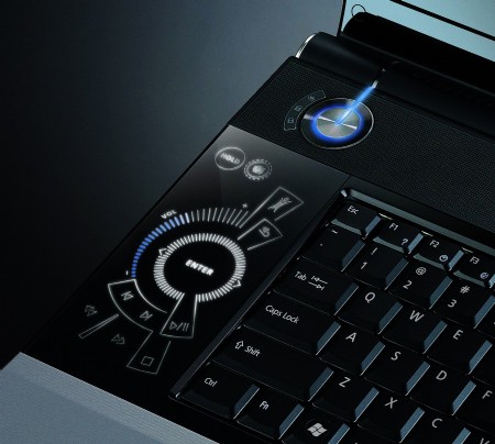 Acer Aspire全新筆記型電腦更加貼心,獨一無二的多媒體飛梭觸控台,配置在鍵盤左區,冷光藍調時尚感十足,高感度的觸控鍵,可輕鬆啟動Aspire Arcade,播放影片或音樂,一指輕觸即可調整音量大小、前進後退、靜音或鎖定鎖等,人性化的界面帶來更加便利的影音生活。